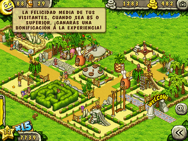 - Exótica Decoración: usa los tótems, templos de piedra, árboles y flores, para decorar tu parque y ayudar a que suba el nivel de agrado de los visitantes (XP) de tu parque.